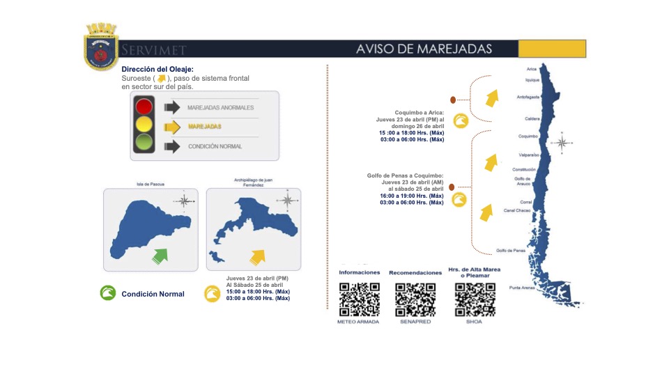 El jefe del Centro Zonal de Meteorología Marina de Valparaíso, Capitán de Fragata Carlos Gaete Mundaca explicó que: "debido a un activo sistema frontal que afectará el sector sur del país, esperamos marejadas con dirección del suroeste a contar del jueves 23 de abril en nuestro litoral, afectando desde Golfo de Penas hasta Arica, incluyendo el Archipiélago Juan Fernández, generando oleaje con rompiente en bahías abiertas a esa dirección. Se estima que su mayor desarrollo se presente durante las horas de pleamar o altas mareas, en particular entre las 13:00 y 19:00 hrs como marea primaria y entre las 03:00 y 06:00 hrs como pleamar secundaria. Estas marejadas corresponden al undécimo aviso que afecta a las costas continentales durante el presente año”.