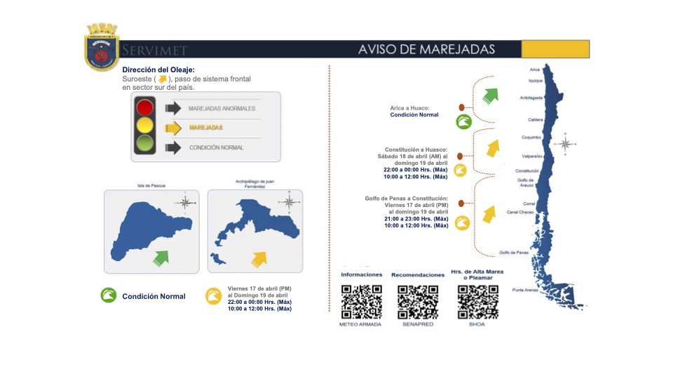 El Jefe del Centro Zonal de Meteorología Marina de Valparaíso, Capitán de Fragata Carlos Gaete Mundaca explicó que: "debido a un activo sistema frontal que afectará el sector sur del país, esperamos marejadas con dirección del suroeste a contar del viernes 17 de abril en nuestro litoral, afectando desde Golfo de Penas hasta Huasco incluyendo el Archipiélago Juan Fernández, generando oleaje con rompiente en bahías abiertas a esa dirección. Se estima que su mayor desarrollo se presente durante las horas de pleamar o altas mareas, en particular entre las 21:00 y 00:00 hrs como marea primaria y entre las 10:00 y 12:00 hrs como pleamar secundaria. Estas marejadas corresponden al décimo aviso que afecta a las costas continentales durante el presente año”.