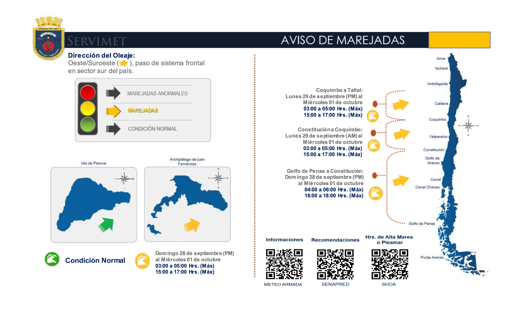 El jefe del Centro Meteorológico Marítimo de Valparaíso, Capitán de Corbeta Felipe Rifo Espósito explicó que: "debido a un activo sistema frontal que afectará el sector sur del país, esperamos marejadas con dirección del oeste/suroeste a contar del día domingo 28 de septiembre en nuestro litoral, afectando desde Golfo de Penas hasta Taltal, incluyendo el Archipiélago Juan Fernández, generando oleaje con rompiente en bahías abiertas a esa dirección. Se estima que su mayor desarrollo se presente durante las horas de pleamar o altas mareas, en particular entre las 03:00 y 06:00 hrs como marea primaria y entre las 15:00 y 18:00 hrs como pleamar secundaria. Estas marejadas corresponden al aviso número veintitres que afecta a las costas continentales durante el presente año”.